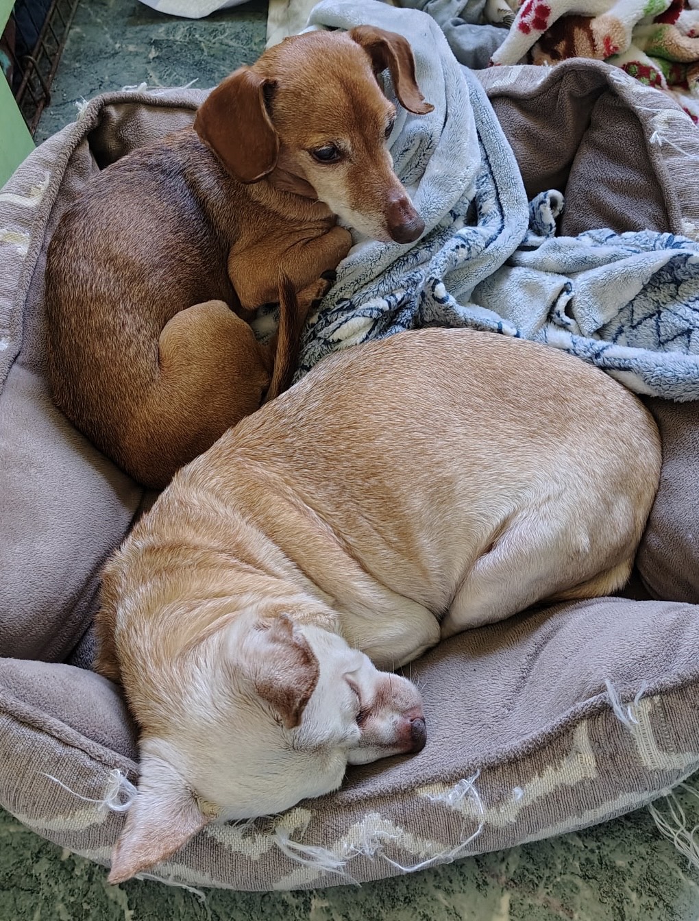 Spike, a charming tan-and-white Chihuahua, is now around 16 years old and under 12 pounds. Though he has lost much of his vision, Spike gets around just fine and continues to show his resilient, gentle spirit. Opie, his handsome red-and-black best friend, is about 15 years old. When he first arrived, Opie was extremely frightened of everything and still prefers not to be picked up, but with time and patience, his loyal heart and sweet nature have begun to shine through.